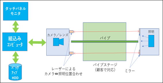 | ✔ 構造が簡単で、高速、低コスト。(特許第6425972) ⇒ 特に細長いパイプの内面傷検査に有効。 ✔ 分散/並列画像処理技術により検査速度を高速化(特願2017-002558) ⇒ 10秒/本の高速化を可能に。 ✔ 新しい管端画像制御技術により自動検査装置を汎用化(特願2017-110374) ⇒ 機種切り替えを容易にし、様々なパイプの内面傷自動検査装置に対応可能。 ⇒ 遮光機構を不要に。小占有面積化でき、装置の設置や移動が容易に。 |